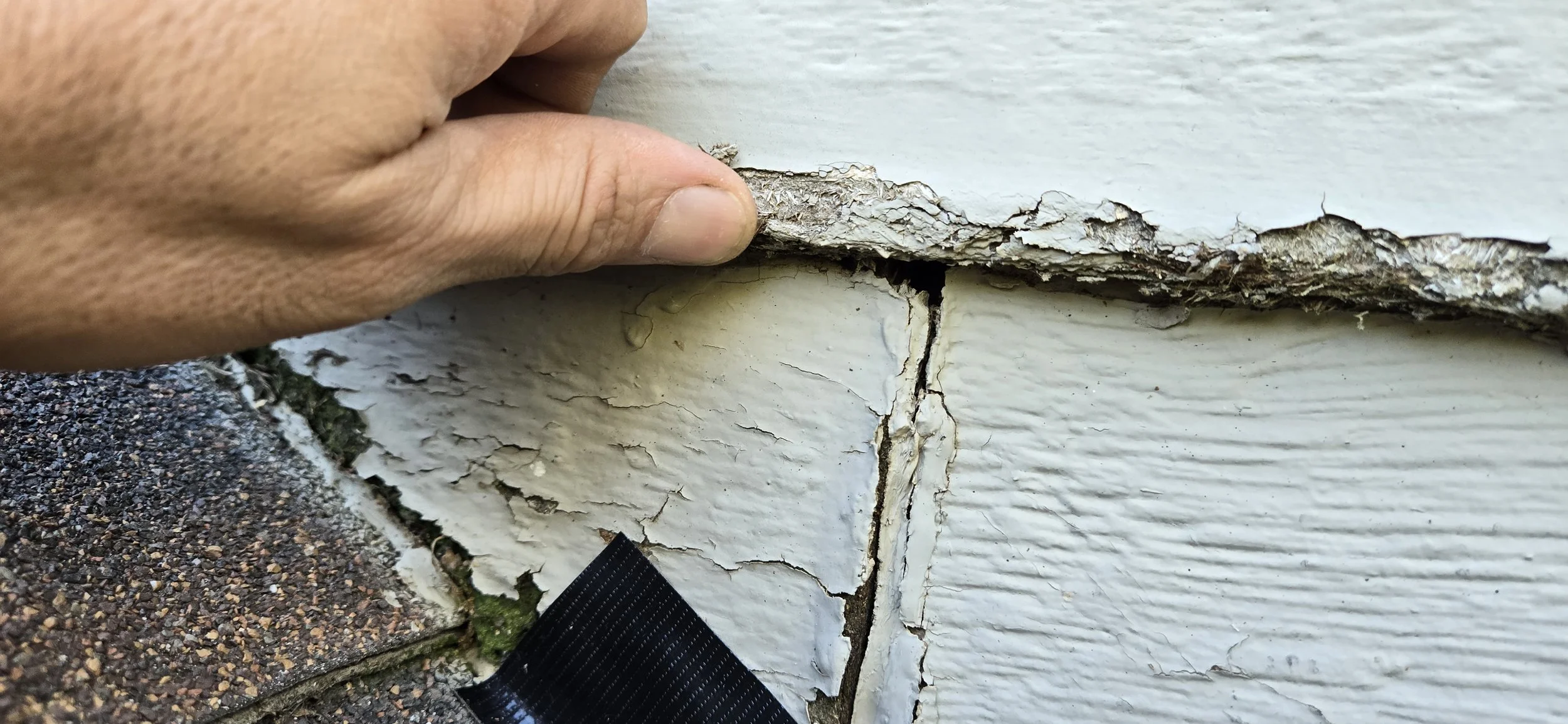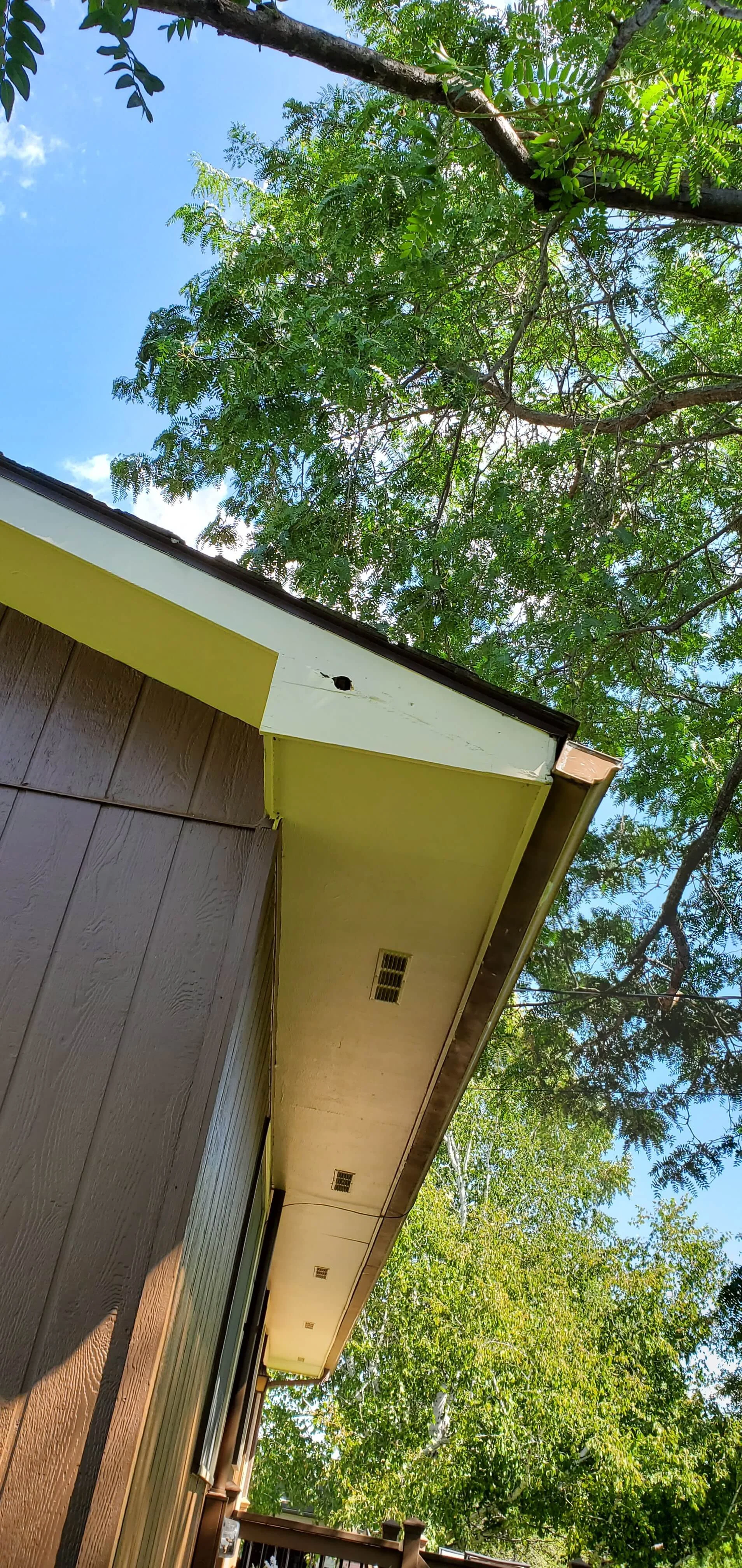 Evidence of woodpecker damage was observed, resulting in damage to the fascia. Further evaluation and repair by a qualified contractor was recommended.